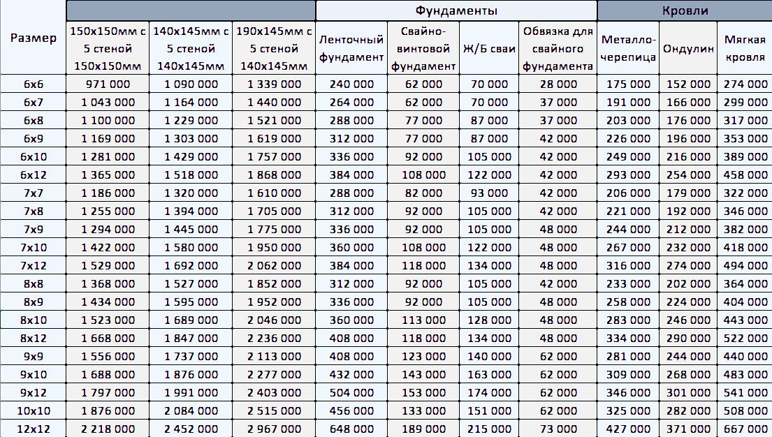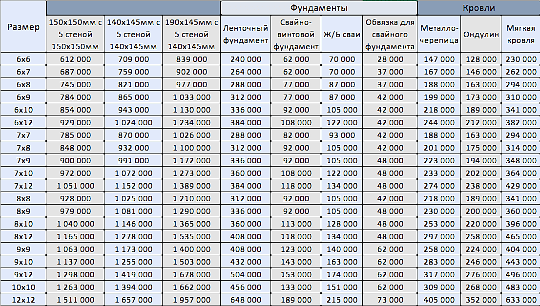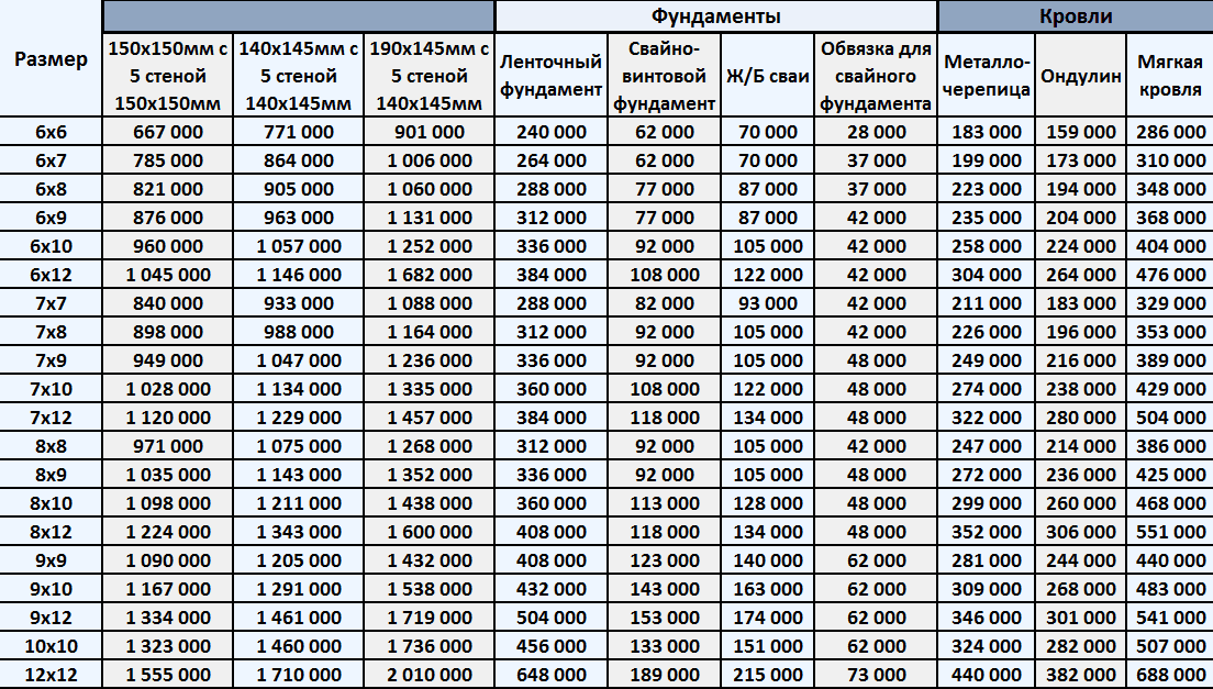 Таблица цен на Pin Up брусовые срубы (декабрь 2024)
